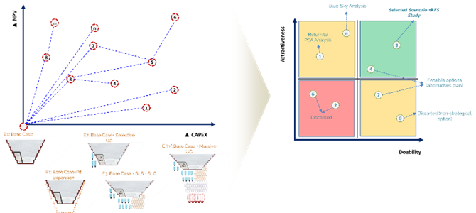 En el caso brasileño, se contrastaron tres vías: continuar el rajo hasta su límite económico (Ruta A), implementar una mina subterránea masiva de manera temprana (Ruta C), y una ruta modular intermedia (Ruta B). Aunque la Ruta C prometía el mayor VPN teórico ($325 millones de dólares), presentaba un riesgo de inversión muy alto y baja ejecutabilidad debido al estrés logístico. La Ruta B (Modular), con un VPN promedio de $310 millones de dólares, dominó estocásticamente a las demás al ofrecer una exposición de riesgo de capital un 40% menor y asegurar la continuidad operativa sin vacíos de producción, convirtiéndose en la opción estratégica recomendada.