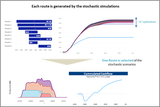 Para resolver esto, la metodología de REDCO incorpora herramientas computacionales de desarrollo propio (SIMPLAN para el rendimiento operativo y SIMVAL para la evaluación económica) que permiten ejecutar simulaciones de Montecarlo sobre toda la cadena de valor minera. En lugar de entregar una única cifra estática, el modelo arroja distribuciones probabilísticas que cuantifican el Valor en Riesgo (VaR) del proyecto, definiendo escenarios pesimistas (P10) y optimistas (P90).
