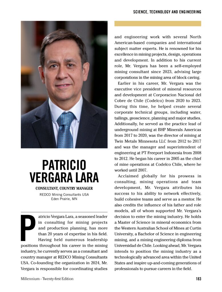 La publicación, que releva a profesionales cuyo trabajo ha tenido un impacto significativo en sus respectivas industrias, aborda más de dos décadas de experiencia de Vergara en roles de liderazgo técnico y estratégico dentro del sector minero, tanto en operaciones como en estudios de ingeniería y planificación de producción.